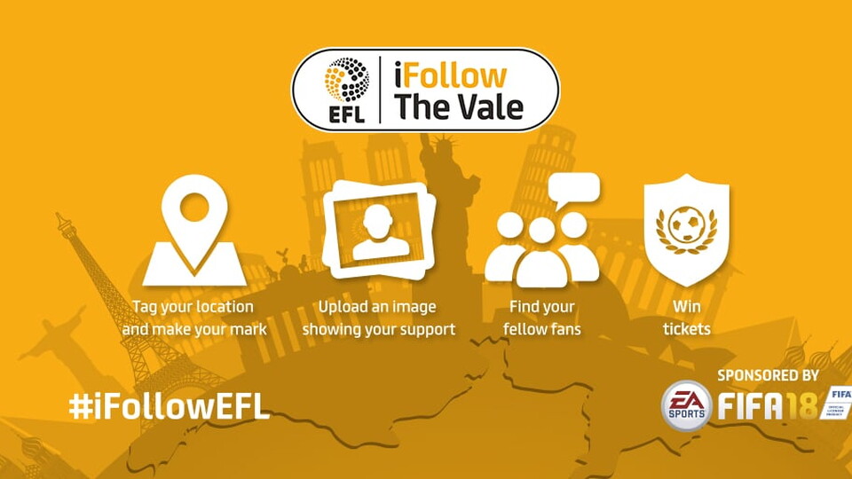 Fans visiting EFL.com/iFollowEFL have the opportunity to tag their location wherever they are in the world and upload an image showing their support for Port Vale. Fans will also have the opportunity to share their image across Facebook and Twitter under the hashtag #iFollowEFL. Fans taking part and showing their club colours before 4th September will be entered into a draw to win tickets to one of Vale’s home games this season, travel and two night’s accommodation, a Mitre Delta Replica EFL Football and a copy of FIFA18 Icon Edition courtesy of EA Sports.