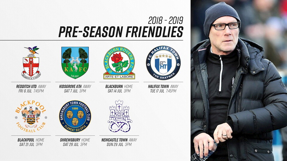 We kick off our pre-campaign away at Dior Angus' former side, Redditch United , on Friday 6th July kicking off at 19:45, and finish off our pre-season with our annual fixture against Newcastle Town, which will see Neil Aspin and his former Port Vale teammate, Robin van der Laan.
