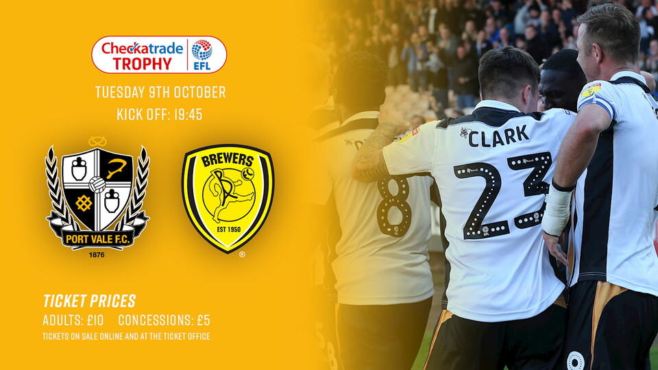 Tickets are now on sale for Vale's Checkatrade Trophy tie against Burton Albion, with Neil Aspin's men scheduled to face the Brewers on Tuesday 9th October 2018 for a 19:45 kick-off.