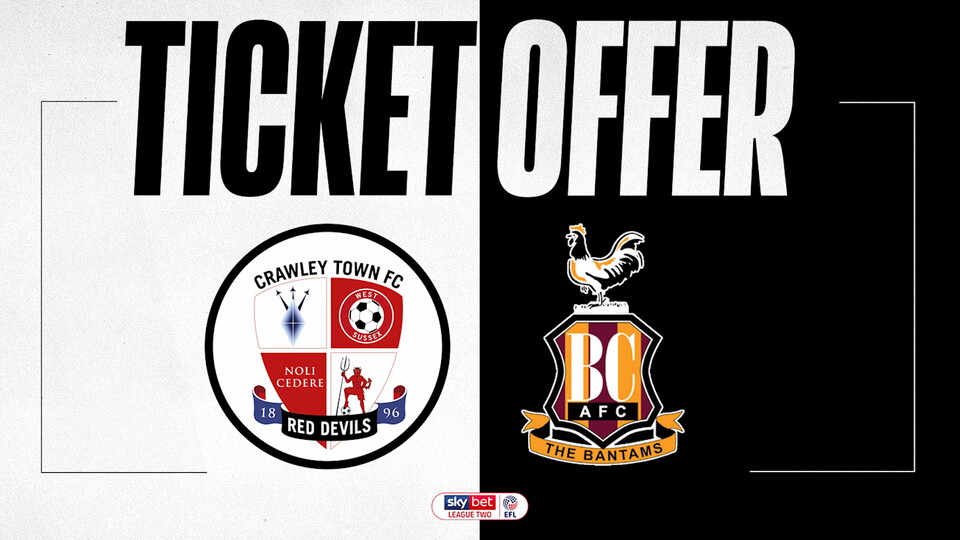 Buy Crawley tickets and get half price tickets for Bradford! Tickets for both games must be purchased at the same time and this offer is not available online. On sale now!
