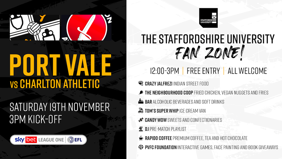 Coming along to the Staffordshire University Fan Zone this Saturday? Here is everything that you need to know ahead of our Sky Bet League One fixture against Charlton Athletic!