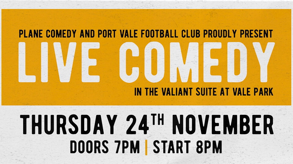 Plane Comedy and Port Vale Football Club proudly present Live Comedy in the Valiant Suite on Thursday 24th November!