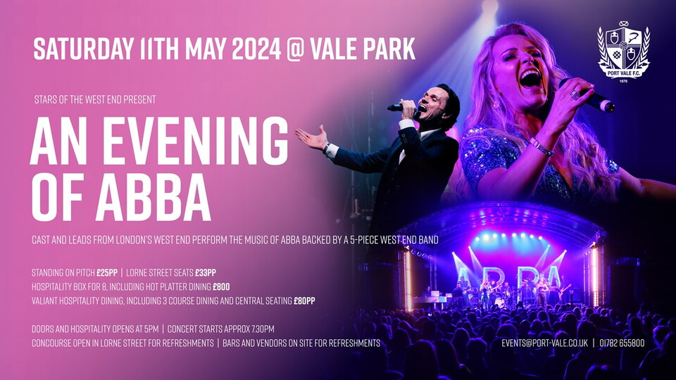 Port Vale’s Venue Sales Manager, Laura Jennings said: “We are over the moon to be welcoming ‘An evening of ABBA’ to Vale Park.