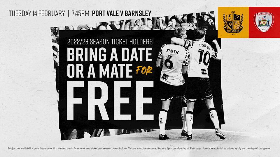 Valentine’s Day at the Vale? We are offering you the chance to ‘Bring a Date or a Mate’ for our 14th February clash with Barnsley at Vale Park (7.45pm kick-off).