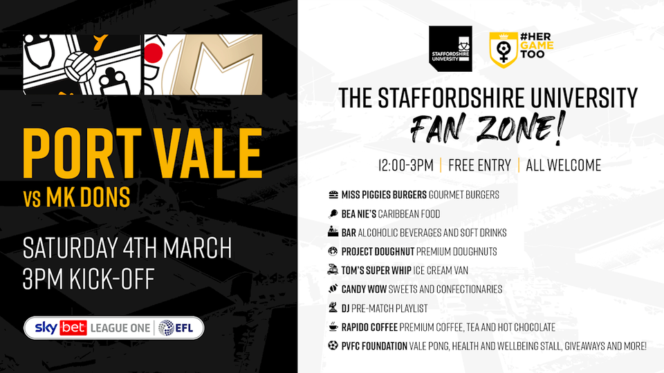Coming along to the Staffordshire University Fan Zone this weekend? Here is everything that you need to know ahead of our dedicated Her Game Too League One fixture against MK Dons!