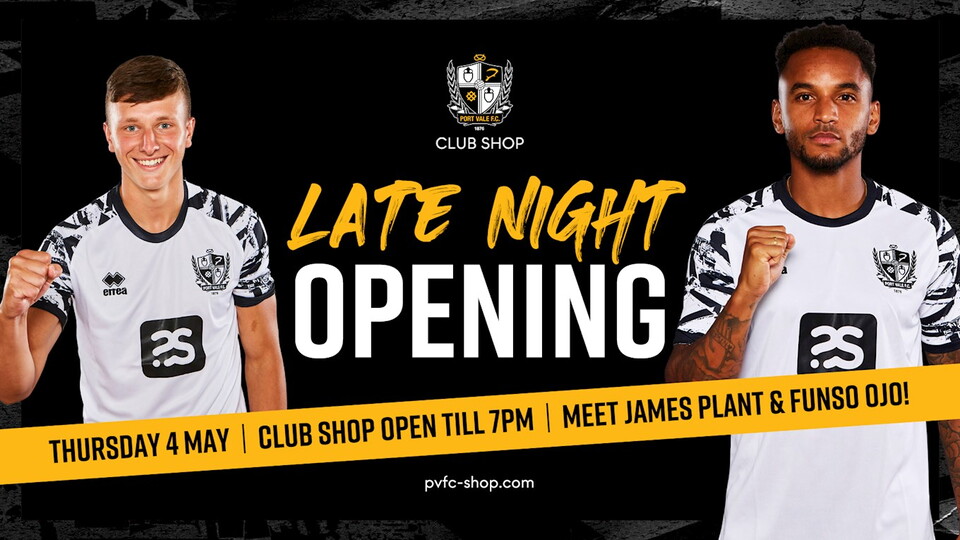 Join us at the Port Vale Club Shop and Ticket Office on Thursday night (04/05) when they extend their opening hours until 7pm with Port Vale first team players Funso Ojo and James Plant in attendance.
