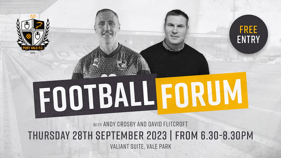 Port Vale FC and Port Vale Supporters Club invite supporters to the Valiant Suite on Thursday, 28thSeptember 2023 for a Football Forum with Director of Football, David Flitcroft and First Team Manager, Andy Crosby.
