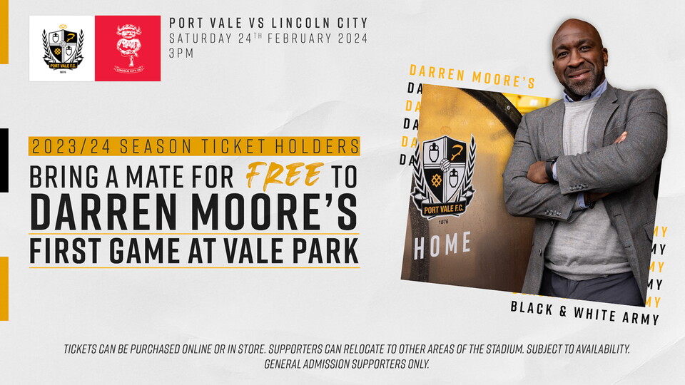 Bring a friend and bring the noise for Darren Moore's first game at Vale Park when we welcome Lincoln City to Burslem.