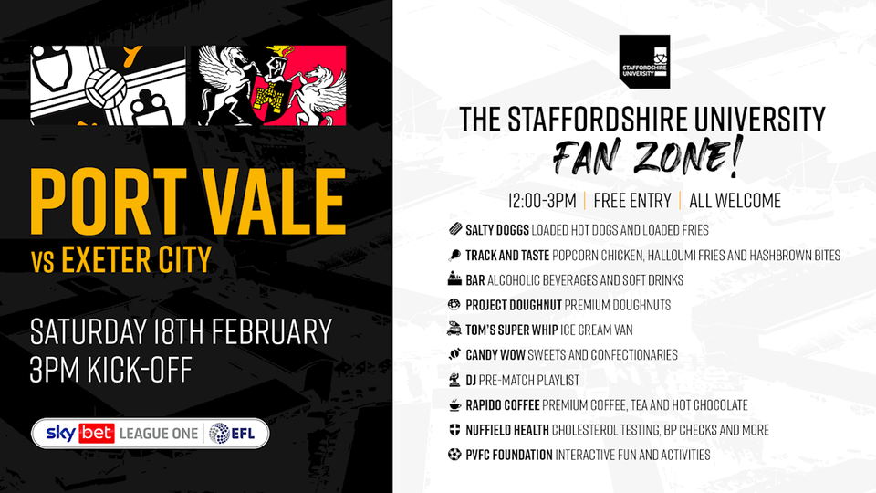 Coming along to the Staffordshire University Fan Zone this weekend? Here is everything that you need to know ahead of our Sky Bet League One clash against Exeter City!