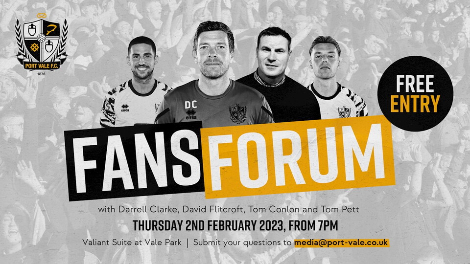Our next Port Vale Fans Forum will take place on Thursday 2nd February in the Valiant Suite, with Darrell Clarke, David Flitcroft, Tom Conlon and Tom Pett the special guests, who will answer your questions on the night.