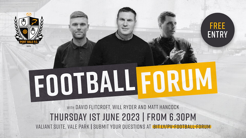 Port Vale FC invites supporters to the Valiant Suite on Thursday, 1st June 2023 for our first-ever Football Forum with Director of Football, David Flitcroft supported by Head of Academy, Will Ryder and Community & CSR Director, Matt Hancock.