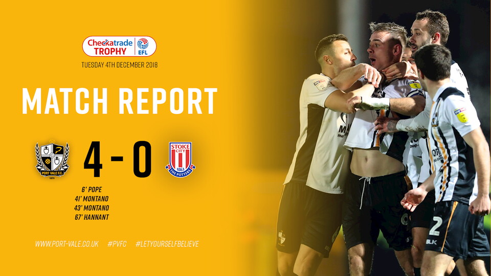 Goals from Tom Pope, Cristian Montano and Luke Hannant see Vale cruise into the round of 16 of the Checkatrade Trophy having overcome Stoke City’s Under-21 squad, 4-0.